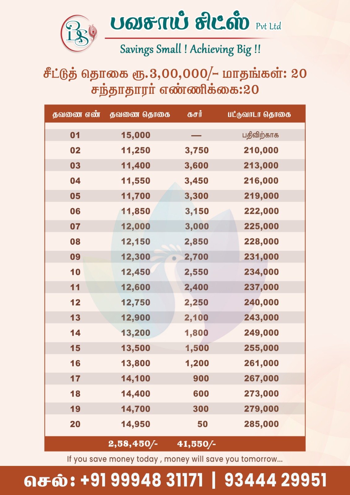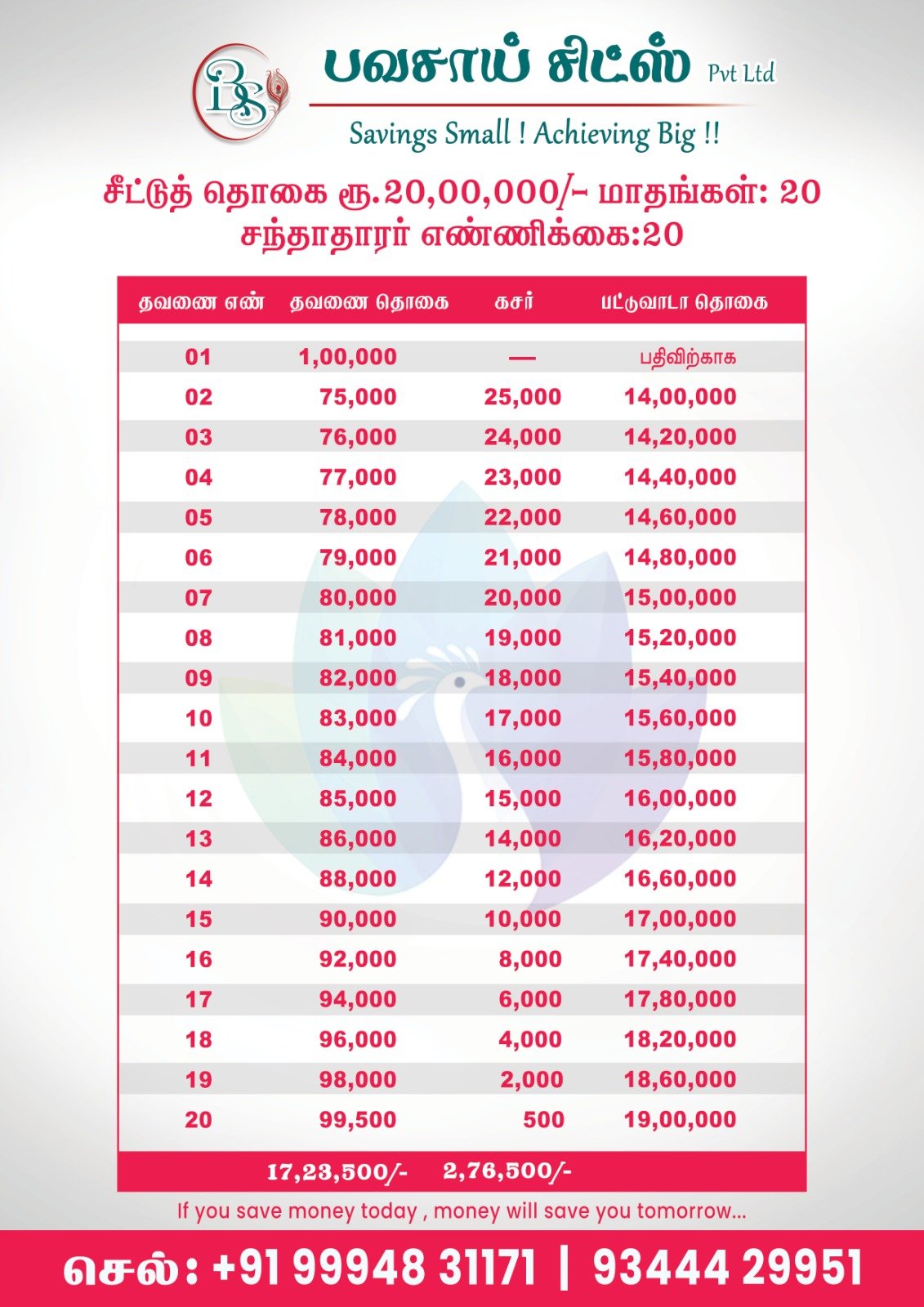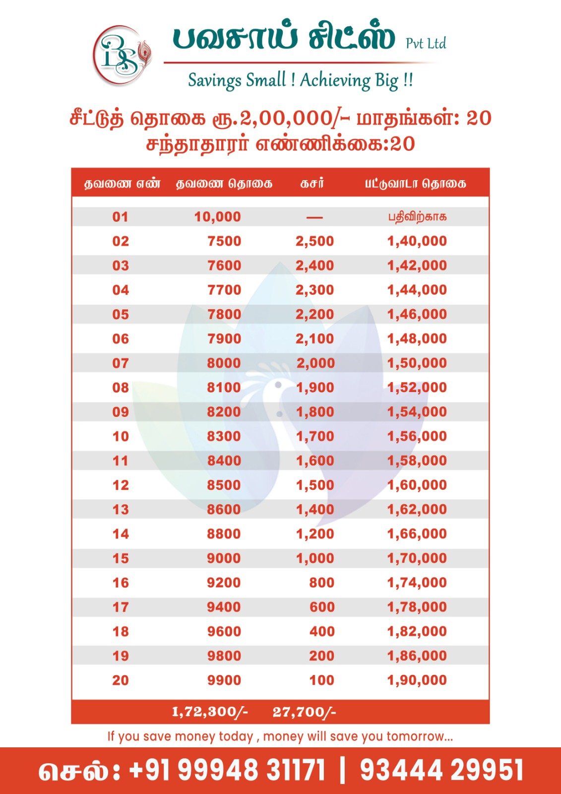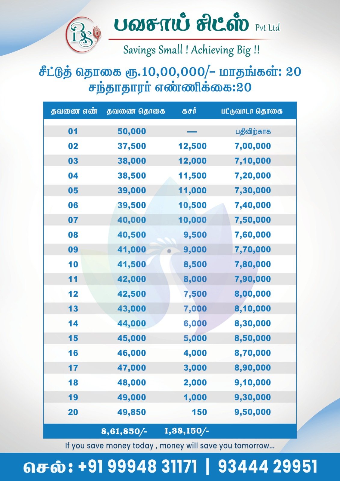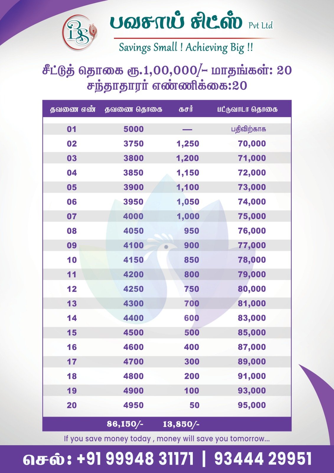 Select a chit fund group that best suits your financial needs. Our plans offer a variety of principal amounts and installment options to fit your budget and savings goals.
